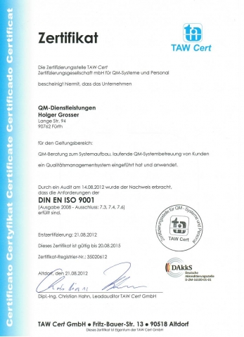 Der QM-Guru Holger Grosser aus Fürth begleitet Unternehmen aller Art zur Zertifizierung nach der ISO 9001. Somit ist es nur natürlich, dass auch er dieses Zertifikat erlangt. Das hat er auch - sogar von zwei unterschiedlichen und unabhängigen Zertifizieren.