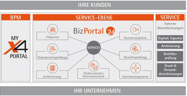 Unternehmen haben zudem die Möglichkeit, aktiv in das Geschehen einzugreifen. So können Unternehmensprozesse mit dem X4 BPM Tool selbst modelliert werden und anschließend in der Cloud zu Verfügung gestellt werden. Die Ausführung dieser Geschäftsprozesse erfolgt im Anschluss direkt über das Rechenzentrum oder im eigenen Hause. Dadurch optimieren bzw. automatisieren Unternehmen ihren Arbeitsablauf und können ihre Mitarbeiter z.B. für einen Freigabeprozess integrieren.