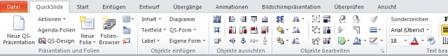 Das QuickSlide-Register gliedert sich in fünf funktionale Gruppen. Über die Gruppe "Präsentation und Folien" können neue Präsentationen erstellt und komplette Folien oder Templates eingefügt werden. Über die Gruppe "Objekte einfügen" können Textfelder, Bilder, Labels, Formen wie Prozesspfeile und Harvey Balls oder Diagramme in eine bestehende Folie eingebunden werden. In der Gruppe "Objekte ausrichten" sind alle Funktionen zusammengefasst, die z.B. für eine exakt bündige Ausrichtung der Objekte aneinander sorgen. Die Gruppe "Objekte bearbeiten" beinhaltet die Befehle, um das Aussehen der Objekte auf einer Folie anzupassen. Die Gruppe "Text bearbeiten" enthält die notwendigen Tools, um textspezifische Einstellungen wie Schriftgröße oder Bullet-Point-Formatierung gemäß dem Unternehmensstandard einstellen zu können.