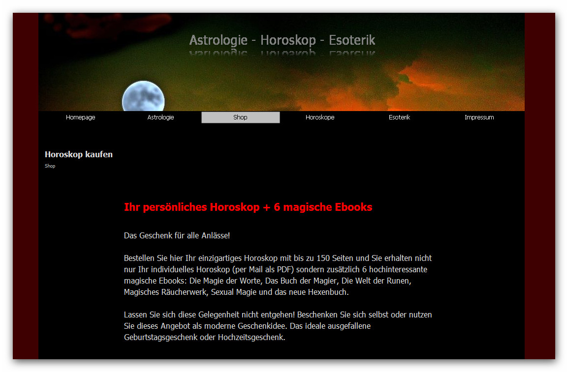 Bei astrologie-horoskop.eu findet der Interesent alle Informationen zum online Shoppen eines Horoskops. Auf der Seite des Onlineshop findet man verschiedenste Angebote, die man kompakt mit dem persönlichen Horoskop erwerben kann. Darunter fallen zusätzlich noch 6 interessante E-Books, die sich mit der Themenwelt der Mythologie auseinandersetzen. Einige der Beispiele wären da -Das Buch der Magier- oder -Die Welt der Ruinen- sowie -Die Magie der Worte-.