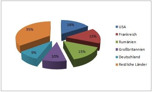Länder, in denen ein hohes Risiko besteht, dass Android-Geräte mit Malware infiziert werden, die es auf monetären Diebstahl abgesehen hat, sind die USA (16 %), Frankreich (15 %), Rumänien (15 %), Großbritannien (10 %) und Deutschland (9 %). Sie machen fast 65 % aller Malware-Berichte in Europa und Nordamerika aus.