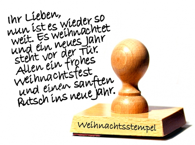 Sich für jeden Bekannten einen persönlichen Text für die Weihnachtskarte zu überlegen, fällt schwer und kostet Zeit. Abhilfe schafft ein Stempel: In Schönschrift platziert er diesen Text auf jeder Karte: "Ihr Lieben, nun ist es wieder so weit. Es weihnachtet und ein neues Jahr steht vor der Tür. Allen ein frohes Weihnachtsfest und einen sanften Rutsch ins neue Jahr."