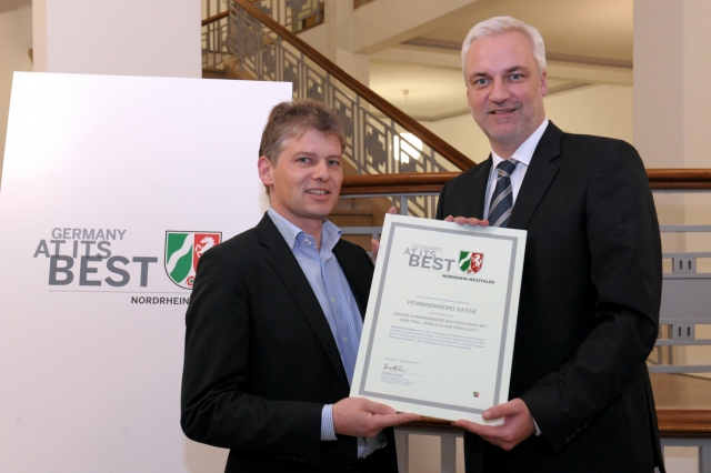 "Es freut mich besonders, dass viele kleine und mittelständische Unternehmen an der Kampagne teilnehmen, darunter auch echte Hidden Champions wie die Feinbrennerei Sasse", sagt Wirtschaftsminister Garrelt Duin. Sie belegten, dass Ideen, Produkte und Verfahren aus Nordrhein-Westfalen in sehr vielen Bereichen das Beste seien, das Deutschland zu bieten habe. Der Minister übergab als Anerkennung in Düsseldorf dazu die Urkunde an Rüdiger Sasse. "Diese Auszeichnung ist für uns eine große Ehre, zeigt es doch, dass selbst kleinere Unternehmen mit außergewöhnlichen Produkten NRW gut repräsentieren", sagt Rüdiger Sasse.