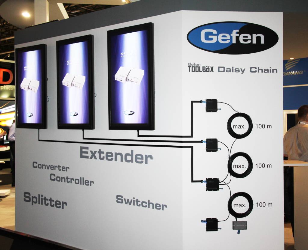 Weiterhin präsentiert Gefen auf der ISE 2013 mit dem Daisy Chain Extender-System ein neues Konzept für Digital Signage-Anwendungen. Das Daisy Chain Extender-System ist eine Lösung, mit der das Signal einer Quelle an bis zu 100 Displays gleichzeitig verteilt und übertragen wird. Diese Lösung besteht aus einem Sender, einem Splitter und einem Empfänger. Die Komponenten können beliebig miteinander unter Verwendung einfacher Netzwerkkabel (Cat.5e oder besser) verschaltet werden, um so die Signale zu verteilen. Das System unterstützt alle HD-Quellen mit HDMI. Dabei werden HDMI-Signale über Distanzen von bis zu 100 Metern zwischen den Displays zusammen mit einem Infrarot-Rückkanal und RS-232 über ein Kabel übertragen. Das System unterstützt Auflösungen von bis zu 1080p Full HD.