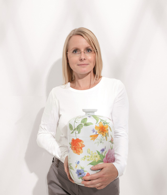 Dabei ist Peggy Morenz in der Branche für Bestattungszubehör eine Quereinsteigerin: Ursprünglich war sie in der Porzellanbranche tätig, für namhafte Hersteller wie Villeroy & Boch, die Marken Rosenthal und Leonardo arbeitete sie als Produkt- und Brandmanagerin. „Tischkultur und Porzellan waren ein wichtiger Bestandteil in meinem Leben“, erklärt Peggy Morenz, „doch gerade die Tischkultur hat sich in den letzten Jahren verändert, sie ist viel unkomplizierter geworden.“ Das habe in der Branche zu Schnelllebigkeit und hohem Aktualitätsdruck geführt. Dem wollte die Existenzgründerin entkommen. „Ich habe nach einem langlebigen Produkt gesucht, das einen Wert besitzt, den Material und Design bekräftigen können.“ So entstand die Idee, die in der Porzellanherstellung gewonnen Kenntnisse für die Gestaltung von Urnen zu nutzen. Dabei sind stilvolle Objekte entstanden, die tatsächlich ein wenig an Omas bestes Geschirr erinnern: Florale Muster, die wie handgemalt aussehen, Goldrandverzierungen und vor allem überaus feines, schimmerndes weißes Porzellan. Doch bei mo van de kamp spielt auch das Zubehör eine Rolle: Kerzen, Karten und Erinnerungsdöschen zum Beipiel für den Ehering mit dem gleichen Design bilden ein ästhetisches Ensemble aus einem Guss.