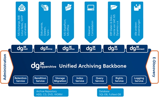 Gartner ist beeindruckt von der Bandbreite an Konnektoren für das zentrale Archive dg hyparchive. Nicht nur alle wesentlichen Mailsysteme, SharePoint, Fileserver und Filer werden unterstützt, sondern auch die größte Auswahl an ERP-Lösungen wie SAP, MS-Dynamics oder JDEdwards. Dazu kommt mit dg connect eine offene Schnittstelle zum Archiv zur individuellen Anbindung von Anwendungen. Mit dieser Funktion wird der derzeit rasant wachsende Bedarf zur Archivierung von Produktionsdaten für ggf. auftretende Produkthaftungsfragen perfekt abgedeckt.