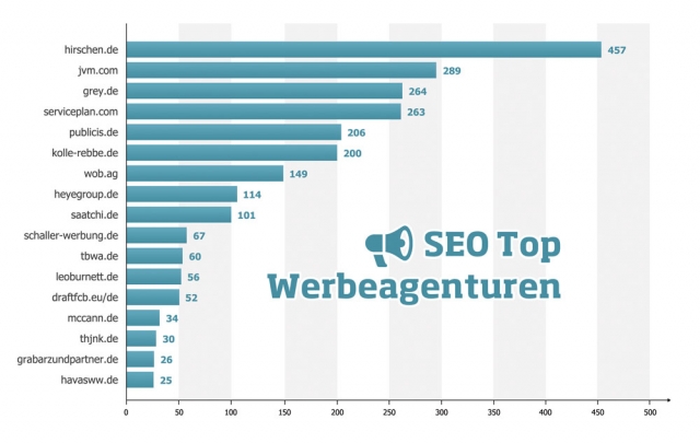 Die SEO Visibility visualisiert den Trend und den historischen Verlauf einer Domain in Suchmaschinen. Der errechnete Wert ist ein wichtiger Index dafür, wie häufig die Eingabe in den Suchergebnissen gesehen wird. Im Ranking der größten Werbe- und Kreativagenturen in Deutschland kann keine einzige Agentur mit einem guten Ergebnis glänzen: Hirschen führt die Liste an und kommt auf insgesamt 457 Index-Punkte. Mit mageren 289 Punkten kratzt Jung von Matt zwar an der Dreihundert, bleibt aber weit hinter einer Bestmarke zurück. Auf dem dritten Platz folgt Grey (264 Punkte), mit nur einem Punkt Abstand zu Serviceplan (263). Das Schlusslicht bilden die Websites von Grabarz & Partner und der Havas-Gruppe mit nur 26 und 25 Index-Punkten.