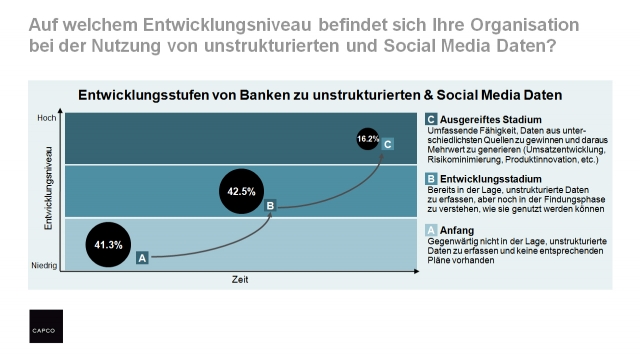 Capco beleuchtet in der aktuellen Studie (http://www.capco.com/capco-institute/research-thoughts/doing-data-differently) unter anderem die Seite der IT bzw. des Datenmanagements: 41 Prozent alle Befragten geben an, aktuell keine Kundendaten aus Social Media zu erheben oder dies zu planen.