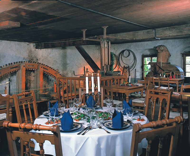 Außerdem findet der Besucher in Vergessenheit geratene, naturnahe Gerichte, die auf einer regelmäßig wechselnden "Jahreszeitenkarte" zu finden sind, beispielsweise Brennnesselsuppe im Frühling, Gerichte aus Holunder und Kürbis im Herbst. Die Bestuhlung lehnt sich fast originalgetreu an die ursprüngliche Einrichtung der Gastwirtschaft an. Einheimische Tischler fertigten die aufwendigen Drechslerarbeiten und das Korbgeflecht nach originalen Vorlagen an. Im Sommer laden zusätzlich 120 Plätze im Biergarten mit Bedienung, sowie 150 Gartenplätze in der Selbstbedienung zum genießen im Mühlengrund ein.
