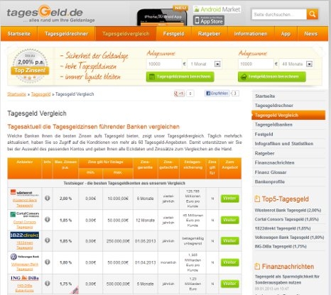 Das Finanzportal Tagesgeld.de bietet unabhängige Vergleiche und Ratgeber mit Fachwissen über Tagesgeld und Festgeld. Umfangreiches Vergleichsportal für Sparer und Anleger, welche sich über aktuelle Zinssätze und Entwicklungen im Tages- und Festgeldbereich informieren wollen.