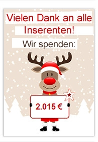 Unter dem Motto"Sie inserieren. Wir spenden."hat der Online-Marktplatz markt.de Anfang Dezember 2012 seine"Weihnachtsspendenaktion"gestartet. Mit jeder Aufgabe einer kostenlosen Kleinanzeige wuchs die Spendensumme im Rahmen der weihnachtlichen Aktion. Der finale Betrag von 2015 Euro kommt nun gemeinnützigen Initiativen an den markt.de Standorten München und Essen zugute.