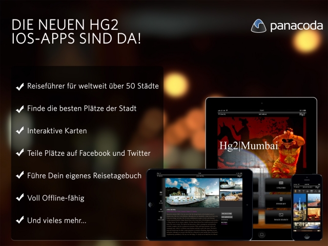 (IINews) - Stuttgart, 23. Januar 2013 - Universelle HTML5-App für intelligentes Reisen mit hedonistischem Anspruch: Panacoda hat für den internationalen Anbieter von Reiseführern "Hg2 - A Hedonist"s guide to..." eine plattformübergreifende App entwickelt. Der gleichnamige mobile Reiseführer für Smartphones und Tablets wurde auf Basis der wegweisenden Open-Source-Technologie "The-M-Project" konzipiert und funktioniert nach dem Prinzip: "Einmal kaufen, auf allen Endgeräten nutzen." Die App bietet Informationen über Top-Städteziele weltweit und überzeugt durch intelligente Features und ansprechendes Design. Seit Dezember 2012 ist die neue Version 2.0 im App-Store erhältlich. Android-Nutzer können ab Februar 2013 auf die App zugreifen, Nutzer von Windows Phone 8 und BlackBerry im Laufe des zweiten Quartals.
