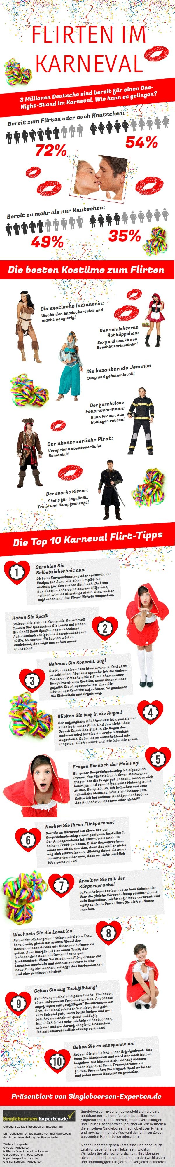 (IINews) - Das Informationsportal für Partnersuche und Online-Dating Singleboersen-Experten.de publiziert ein umfassendes Special zum Thema Karneval 2013. Neben Zahlen, Daten und Fakten zum Karneval in Deutschland, zeigt das Special die Flirt-Kostüm Trends 2013, gibt ausführliche Flirt-Tipps und listet die besten Events und Locations in den Karnevalshochburgen Köln, Düsseldorf, Mainz. Die wesentlichen Tipps und Fakten hat Singleboersen-Experten.de in einer Infografik anschaulich aufbereitet.