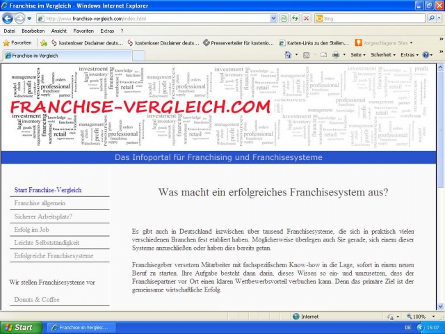 Franchise-Vergleich.com ist das Portal, welches seriöse und interessante Geschäftsmodelle vorstellt. Das Wort Franchise ist französischen Ursprungs, bedeutete früher die Befreiung von Abgaben oder Gebühren und bezeichnet heute ein bestimmtes Nutzungsrecht. Der Franchisenehmer erlangt vom Franchisegeber vertraglich das Recht, seinen Namen, seine Produkte/Dienstleistungen und seine geschützten Marken zu nutzen. Franchisegeber, die besondere Geschäftsideen, Leistungen gepaart mit hervorragenden Konditionen anbieten, werden von Franchise-Vergleich mit dem Prädikat "Franchise Company of the Year" ausgezeichnet.