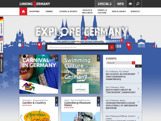 (IINews) - Wiesbaden, 5. Februar 2013 - Deutschland hat einiges mehr zu bieten als Bratwurst, Bier und Burgen. Doch leider wissen viele der hier stationierten US-Soldaten nicht, woher sie wertvolle Tipps für den Alltag in der neuen Heimat bekommen können. Welche Ausflugsziele für die Familie gibt es in der Region? Wo findet man englischsprachige Angebote wie beispielsweise einen Tierarzt? Und welche deutschen Sitten sollte man kennen? Antworten auf solche Fragen gibt nun das Online-Portal LinkingGermany (http://www.linkinggermany.com/) das für die US-Community im Großraum Wiesbaden Tipps zu Shopping, Freizeit & Sport, Reise & Kultur oder Family & Kids bereithält. Informationen über deutsche Bräuche und ein Veranstaltungskalender runden das Angebot ab.