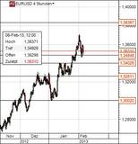 Nach dem Anstieg auf knapp über 1,37 korrigierte Euro-Dollar bis 1,3460, um dann in der Nacht auf den heutigen Mittwoch wieder auf 1,36 zu steigen. Heute Vormittag dann wieder Sorgen um Italien, nachdem auch die neueste Umfrage den Vorsprung Berlusconis in den am 20.Februar stattfindenden Wahlen bestätigte. Die Gemeinschaftswährung fiel daraufhin unter die 1,35, kann sich seitdem jedoch wieder erholen.