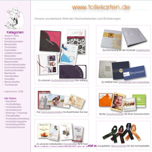 (IINews) - Burgthann, 07.02.2013. Hochzeit, Geburt, Taufe oder Jubiläum, es gibt viele Anlässe, zu denen Karten als Einladung, Benachrichtigung oder Danksagung benötigt werden. Auch zu Weihnachten werden trotz stetig fortschreitender Digitalisierung nach wie vor klassische Karten per Post verschickt. Die Individualität der Karten wird dabei zunehmend wichtiger, aber das Aussehen soll professionell und nicht selbstgebastelt aussehen. Tollekarten aus mit mittelfränkischen Burgthann bei Nürnberg bietet die Möglichkeit, über die Website http://www.tollekarten.de vorgefertigte Layouts mit eigenen Fotos, Namen und Daten zu personalisieren und diese in gewünschter Stückzahl zu drucken. Der Versand erfolgt anschließend an jeden gewünschten Ort.