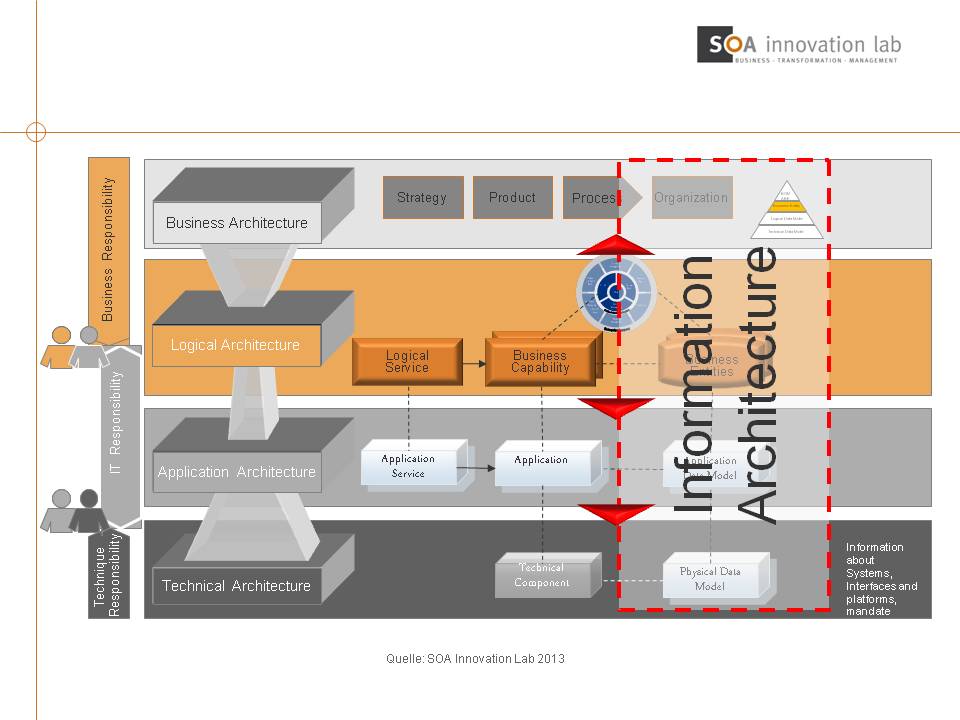 Bild: Die Informationsarchitektur betrifft sämtliche Bereiche des Enterprise Architecture Managements, angefangen bei der technischen, bis hin zur Business-Architektur. Damit tragen IT- als auch Business-Vertreter die Verantwortung dafür.