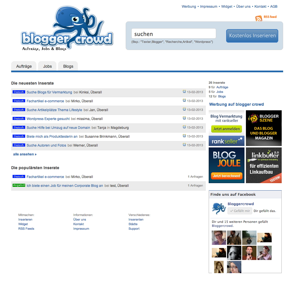 Blogger Crowd bietet auf ihrer Plattform Aufträge und Jobs aus der Welt der Blogosphäre an. Die Bandbreite der Angebote reicht dabei vom Text-Auftrag bis zum vollständigen Blog-Aufbau. Mit den ausgeschriebenen Aufträgen und Jobs erreicht man zielsicher den richtigen Partner für jedes Projekt. Während Blogger innerhalb kürzester Zeit relevante Dienstleister für ihre Aufträge finden, profitieren Dienstleister von den zusätzlichen Jobs.