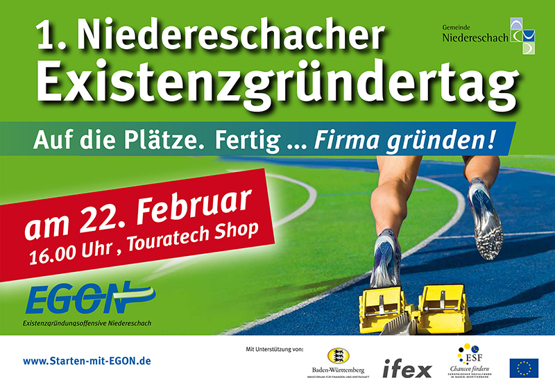 (IINews) - Niedereschach. Unter dem Motto "Auf die Plätze. Fertig. Firma gründen!" startet die Gemeinde Niedereschach am Freitag, 22. Februar, 16 Uhr, ihre Existenzgründungsoffensive. Der Startschuss fällt beim 1. Niedereschacher Existenzgründertag im Shop der Firma Touratech AG im Gewerbegebiet. Die öffentliche Informationsveranstaltung für Bürger der Gemeinde und Interessenten aus der gesamten Region beginnt mit der Premiere des ersten Werbefilms über den Wirtschaftsstandort Niedereschach.