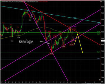 Unter 7.661-7.694 wird derzeit mit weiter nachgebenden Kursen gerechnet. Supportlevels sehen wir für heute bei 7.626-7.607-7.593 und 7537. Die nächsten Ziele unter7.537 Punkten liegen bei 7.478 und 7.450-7.425-7.350 und 7.300 Punkten. Ein Bruch des gestrigen Tagestiefs (7.607 Punkte) heute würde dieses bärische Szenario weiter untermauern.