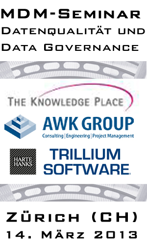 (IINews) - Am 14. März 2013 findet in Zürich (CH) ein Seminar zum Thema Stammdatenmanagement statt. Datenqualität und Data Governanace sind die Kernthemen bei diesem Fachkurs, der von der AWK Group, Trillium Software und dem Seminaranbieter The Knowledge Place veranstaltet wird.