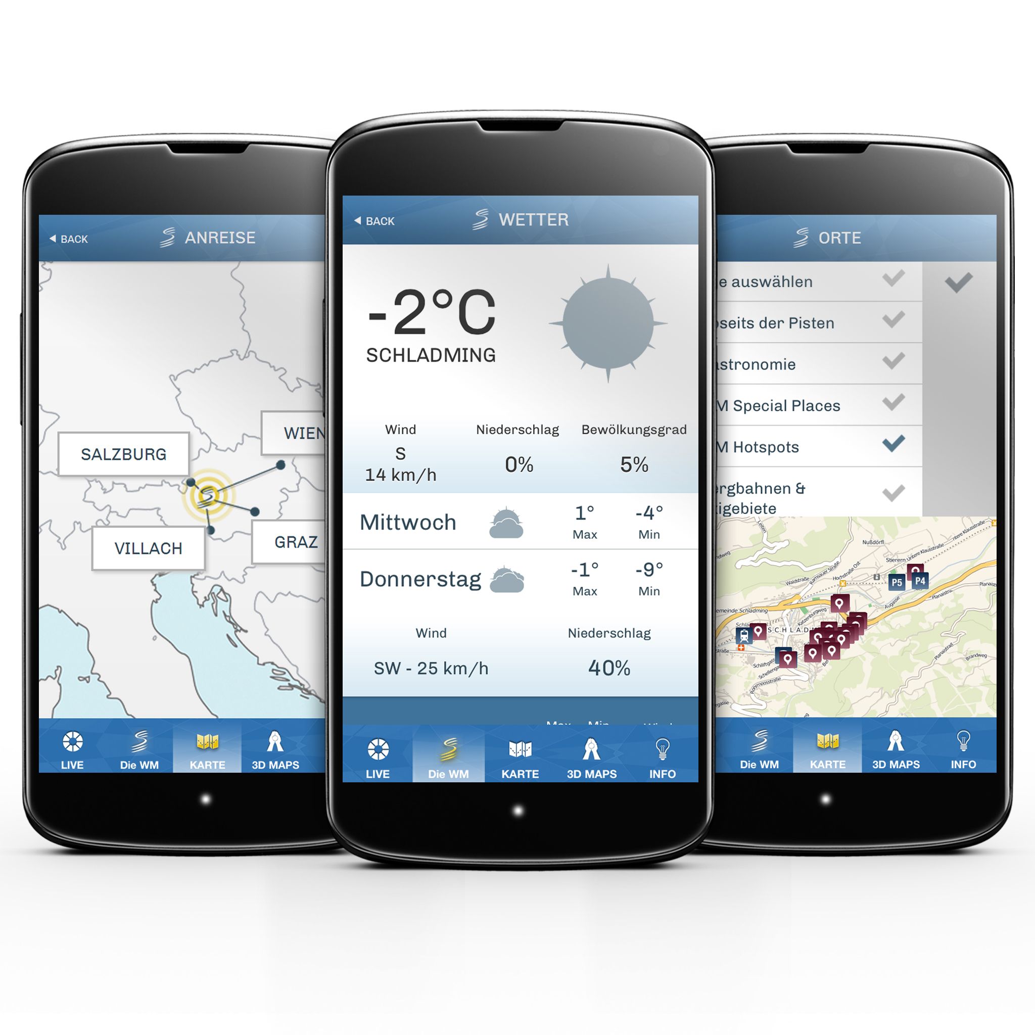 (IINews) - Neben Anreiseguide und aktuellen Verkehrsmeldungen können WM-Begeisterte auch via LiveScreen und LiveTicker jedes Rennen hautnah verfolgen. Darüber hinaus werden News, Termine, Bildergalerien und Videos rund um die WM und ihren Stars bereitgestellt, aber auch Informationen zu Events, Restaurants oder anderen touristischen Highlights können einfach und bequem via Smartphone abgerufen werden. Ein neuer Maß-stab wurde mit der Integration der virtuellen 3-D-Welt von Schladming gesetzt! Live und per GEO-Verortung steht den Besuchern eine völlig neue Perspektive der Veranstaltungsregion zur Verfügung.