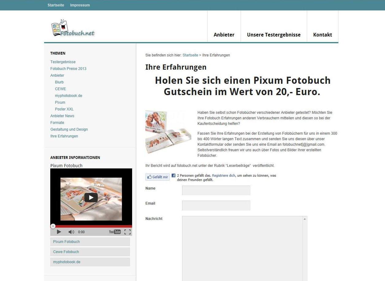 (IINews) - Köln, den 21.Februar 2013. Fotobuch.net ist eine informative und vor allem innovative Website, denn hier können User ihre Erfahrungen beschreiben, die sie mit Fotobüchern im Internet gemacht haben. Jetzt startet die Plattform eine neue Aktion für Verbraucher: Auf jeden User, dessen Erfahrungsbericht auf Fotobuch.net veröffentlicht wird, wartet ein Gutschein für ein Pixum Fotobuch - in Höhe von 20 Euro.
