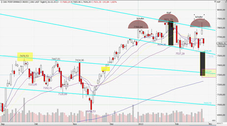 Die Wahl in Italien hatte auch die asiatischen Märkte fest im Griff. Der Nikkei-Index tendierte bis zum späten Vormittag 1,65 Prozent tiefer bei 11.469 Punkten. Der breiter gefasste Topix-Index fiel um ein Prozent auf 970 Punkte. Der Dow Jones erlitt den größten Tagesverlust seit 7.11.2012. Er verlor 1,55 Prozent auf 13 784,17 Punkte. Die Nasdaq gab um 1,44 Prozent auf 3116,25 Punkte nach. Der S&P 500 gab prozentual so stark nach wie seit Anfang November nicht mehr an einem Tag. Er büßte 1,83 Prozent auf 1487,85 Punkte ein. Der DAX wird das GAP 7.681 Punkte heute schließen, aber er wird damit auch wieder ein neues GAP bilden.