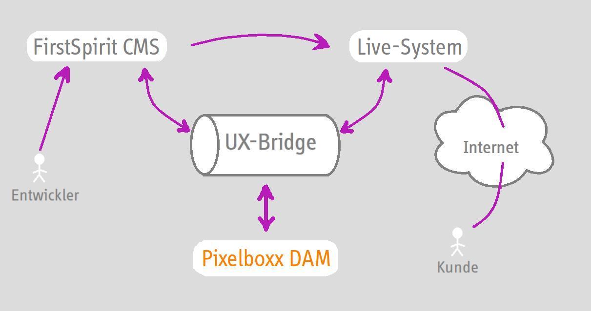 FirstSpirit als CMS bekommt mit der UX-Bridge jetzt eine dynamische Funktionalität, mit der diese Austauschprozesse sehr einfach realisiert werden können. Das Beispiel der Integration des Digital Asset Management Systems der Pixelboxx mit FirstSpirit zeigt das Potenzial dieser Integrationsinfrastruktur. Beide Systeme verwalten als Backend-Systeme auf der Redaktionsseite Content und liefern diesen aus. Mit der Integration über die UX-Bridge als Kommunikationsbus, kann die Verwendung von Medien aus der Pixelboxx in FirstSpirit realisiert werden.