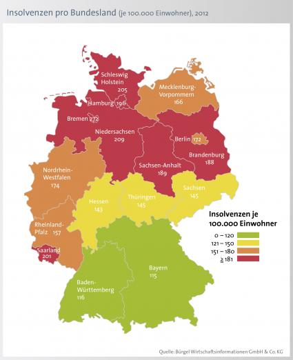 Pleiten je 100.000 Einwohnern am besten ab. Gute Werte weisen auch