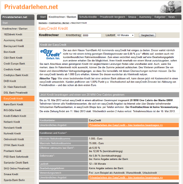 Privatdarlehen.net informiert: Neues Frühjahrsaktion bei easyCredit Bis zum 10. Mai 2013 verlost easyCredit 20 MINI One Cabrios unter allen Kreditinteressenten