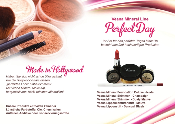 (IINews) - Haben Sie sich nicht schon öfter gefragt, wie die Hollywood-Stars diesen "perfekten Look" hinbekommen? Mit Veana Mineral Make-Up, hergestellt aus 100% reinsten Mineralien! Unsere Produkte enthalten keinerlei künstliche Farbstoffe, Öle, Chemikalien, Auffüller, Additive oder Konservierungsstoffe.