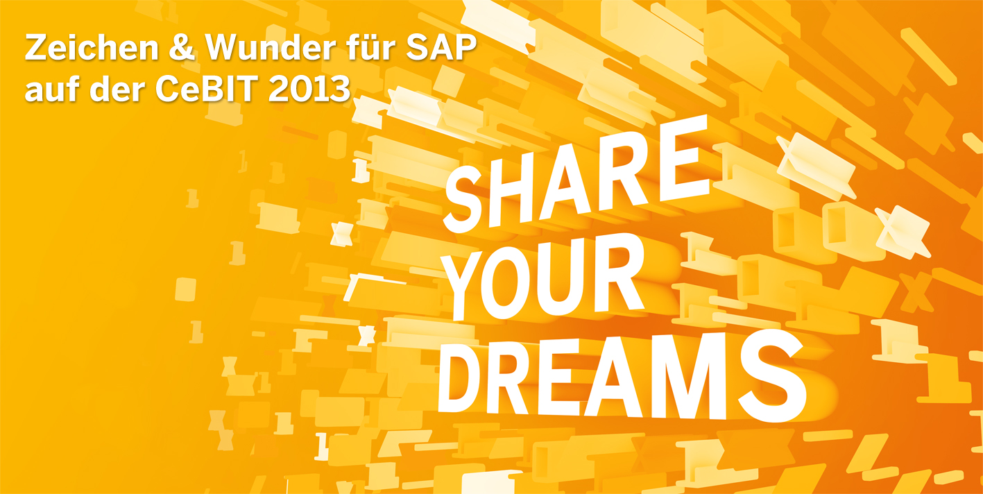 Nachdem die Münchner Agentur Zeichen&Wunder den CeBIT Auftritt von SAP mit ihrem neuen Messe-Konzept im Jahr 2012 zu einem wahren Erfolg werden ließ, setzen beide die Zusammenarbeit für die CeBIT 2013 fort. Unter dem Motto"Share your dreams"wird es vom 05.–09. März 2013 einen starken Markenauftritt auf imposanten 5.000 qm geben.
