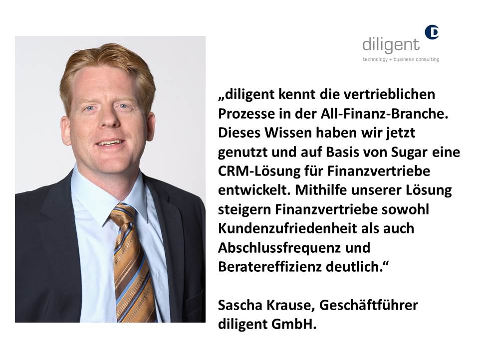 "diligent kennt die vertrieblichen Prozesse in der All-Finanz-Branche. Dieses Wissen haben wir jetzt genutzt und auf Basis von Sugar eine CRM-Lösung für Finanzvertriebe entwickelt. Mithilfe unserer Lösung steigern Finanzvertriebe sowohl Kundenzufriedenheit als auch Abschlussfrequenz und Beratereffizienz deutlich", so Sascha Krause, Geschäftführer diligent GmbH.