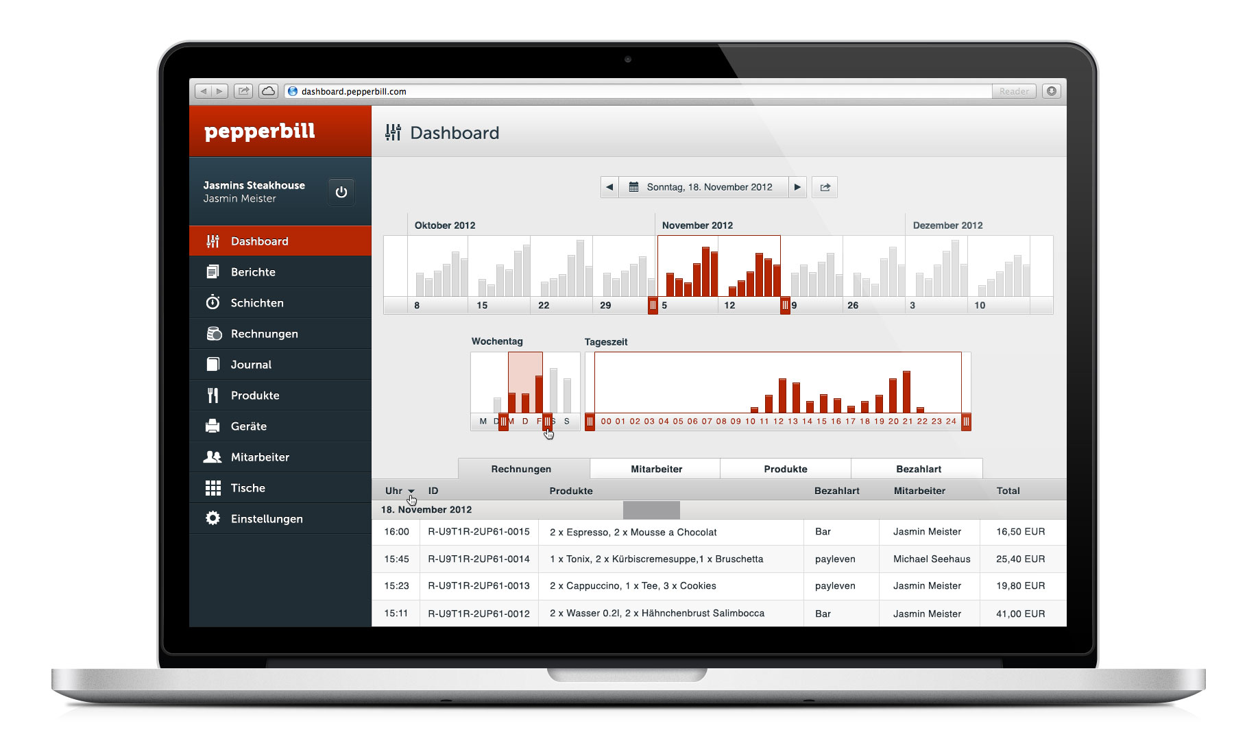 Das pepperbill Dashboard ist mit jedem stationären oder mobilen Internetbrowser abrufbar und bietet Gastronomen die Möglichkeit, weltweit auf die visuell dargestellten Informationen zuzugreifen, Änderungen an den Stammdaten vorzunehmen, Berichte zu erstellen oder Menü-Karten zu pflegen. Die Echtzeit-Organisation der Daten wird ermöglicht durch die fortschrittliche pepperbill Cloud-Technologie, die die Organisation innerhalb der Unternehmen erleichtert.