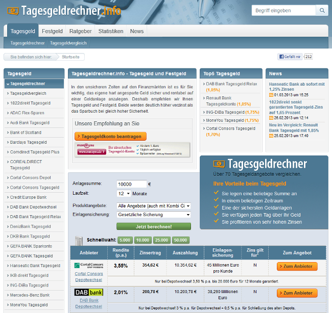 Das Anlageportal Tagesgeldrechner.info der Concitare GmbH ist ein kostenloses und redaktionell betreutes Vergleichsportal für Tagesgeld und Festgeld. Mit professionellem Tagesgeldrechner und Festgeldrechner können Verbraucher sich schnell, umfassend sowie individuell über die aktuellen Konditionen der Finanzprodukte informieren. Zusätzlich erhalten Leser regelmäßige News zum Thema und können diverse Ratgeber für sich gewinnbringend nutzen. Top-Empfehlungen sowie direkte Antragsmöglichkeiten erleichtern die Suche nach dem maßgeschneiderten Tagesgeld- bzw. Festgeldkonto.