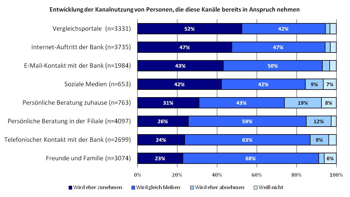 Bei der Analyse des Nutzungsverhaltens von Personen, die die entsprechenden Kanäle bereits nutzen, zeigt sich, dass vor allem die Online-Recherche und -Beratung deutlich zunehmen wird: Vergleichsportale werden von 52 % häufiger herangezogen, der Internet-Auftritt von Banken von 47 %. Nur bei 3 % der Personen, die bereits Vergleichsportale bzw. den Internet-Auftritt von Banken besuchen, wird deren Nutzung zurückgehen. Auch der E-Mail-Kontakt mit der Bank sowie Social-Media-Anwendungen werden in Zukunft zur Bankberatung vermehrt in Anspruch genommen (43 % bzw. 42 %). Die Hälfte der Personen, die per E-Mail mit ihrer Bank bzw. ihrem Berater in Kontakt treten, wird diese Form der Kontaktaufnahme wie bisher nutzen.