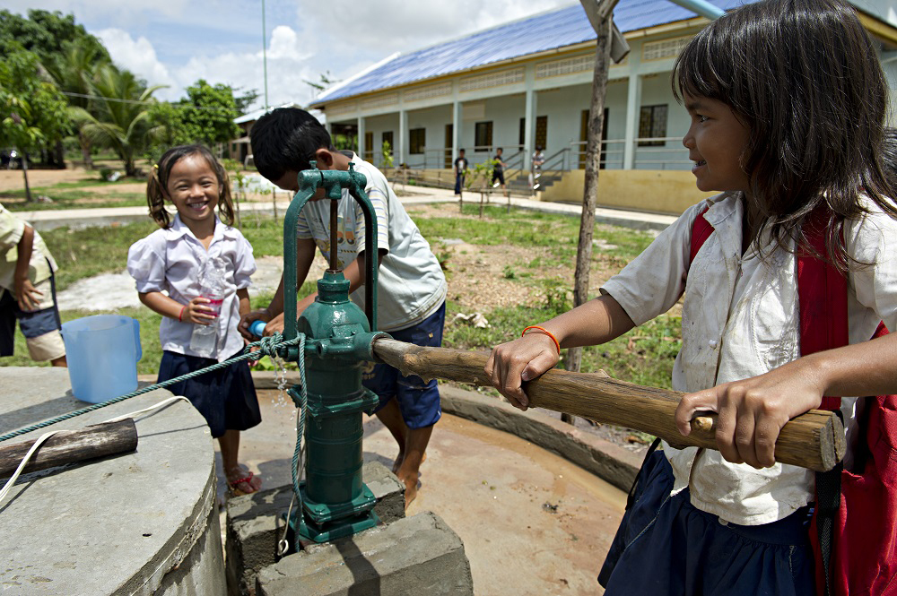 1. Kinder mit Trinkwasserbrunnen in Kambodscha