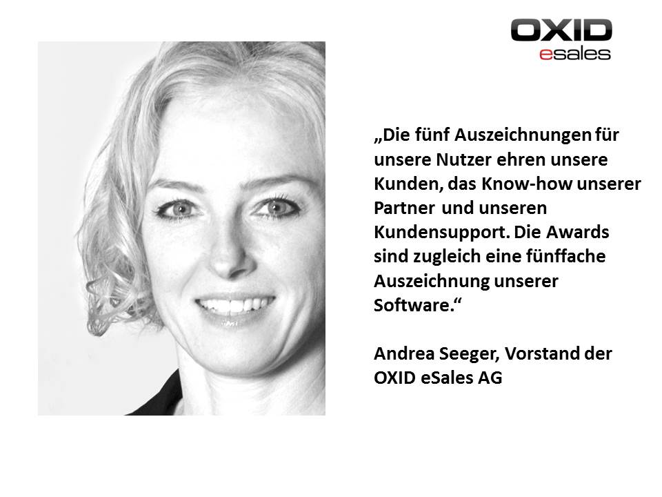 "Die fünf Auszeichnungen für unsere Nutzer ehren unsere Kunden, das Know-how unserer Partner und unseren Kundensupport. Die Awards sind zugleich eine fünffache Auszeichnung unserer Software", sagt Andrea Seeger, Vorstand der OXID eSales AG.