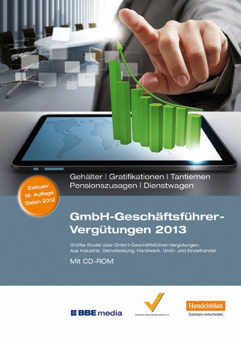 Die aktuellen Gehaltsdaten von mehr als 3.550 GmbH-Geschäftsführern in 71 Branchen enthält die neue BBE-Studie „GmbH-Geschäftsführer-Vergütungen 2013“. Ein dazu gehörendes exklusives Auswertungsprogramm auf CD-ROM erlaubt eine individualisierte Suche nach acht unterschiedlichen Kriterien. Das ermöglicht das schnelle Abrufen von Vergleichsdaten für die Wirtschaftszweige Einzelhandel, Groß-handel, Handwerk, Industrie und Dienstleistung.