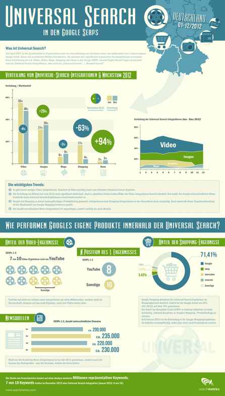 (IINews) - Berlin, 27. März 2013__Seit einigen Jahren zeigen Suchmaschinen in den Ergebnislisten nicht mehr nur eine Auflistung klassischer Links an, sondern binden verstärkt Boxen mit zusätzlichen Medien wie Bilder, Videos, News und Maps, in die Darstellung mit ein. Wie sich diese als "Universal Search" bekannten Integrationen über einen längeren Zeitraum in Deutschland und den USA entwickeln, und was sich daraus für die Performance von Unternehmen im Web ableiten lässt, haben die Experten von Searchmetrics in einer umfangreichen Studie zusammengefasst.