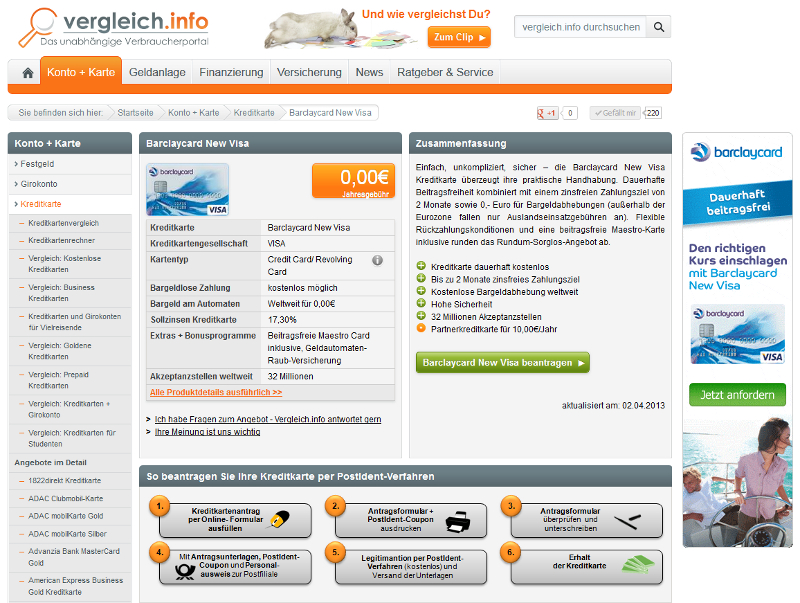 Die Barclaycard New Visa ist derzeit die Top-Empfehlung im Kreditkarten-Vergleich auf http://www.vergleich.info/konto-karte/kreditkarte/kreditkartenvergleich/