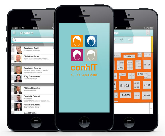 Die Messe-App für iOS und Android begleitet die Fachbesucher in allen Bereichen der conhIT: Industrie-Messe, Kongress, Akademie und Networking. Sie können sich über Aussteller und Produkte informieren und ihre Favoriten in einer Merkliste speichern. Sehr vorteilhaft ist auch das übersichtliche Programmverzeichnis. Hier können Nutzer Events nach Tagen und Zeitfenstern filtern und besonders interessante Veranstaltungen zum Smartphone-Kalender hinzufügen. Außerdem können sämtliche Informationen zu den einzelnen Speakern entnommen werden.