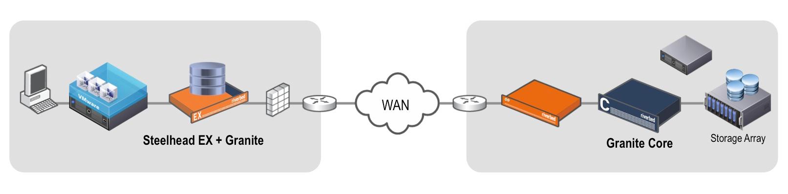 Für den RZ-Konsolidierungsansatz von Riverbed sind zwei Komponenten erforderlich: zum einen Granite Core, eine physische oder virtuelle Appliance im Data Center, und zum anderen Granite Edge, ein Dienst, der in der Zweigstelle auf einer Steelhead EX-Appliance betrieben wird. Alternativ ist Granite Edge als eigenständige Lösung verfügbar und kann mit bestehenden Steelhead Appliance (nicht EX)-Installationen verwendet werden.