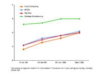 Die Unternehmen bewerteten die Relevanz der Trends also mit gerade noch "ausreichend"; am besten schnitt das Thema Desktop-Virtualisierung ab. Je größer die Unternehmen waren, desto eher erkannten die Befragten eine praktische Relevanz. Der Unterschied zwischen der Bewertung der kleinsten befragten Unternehmen (51 bis 100 Mitarbeiter) und der größten (1.001 bis 2.000) lag bei etwa einer Note. Cloud Computing etwa wurde von diesen Gruppen durchschnittlich mit 5,2 im Vergleich zu 4,0 benotet. Ähnlich verhält es sich bei Big Data und BYOD. Ausnahme: die Desktop-Virtualisierung, die ohnehin am besten bewertet wurde (mit 3,4 beziehungsweise 3,0 von den jeweils kleinsten und größten befragten Unternehmen).