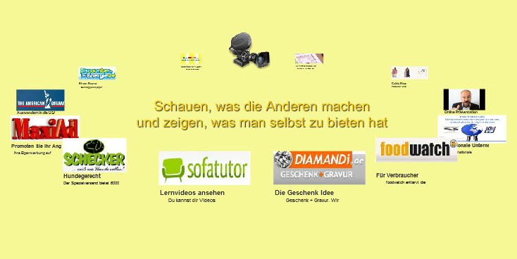 „Für jedes Video einer Firma, egal ob eingesetzt als Werbefilm, Video Email, Video Newsletter, Produkt oder Dienstleistungs Video bieten wir im Zusammenhang mit dem kostenfreien Firmeneintrag eine weltweit einmalige Präsentations Plattform, den Video Spin im Branchenverzeichnis gelbevideos.com. Hier können sie mit wenigen Klicks täglich neue Videos zu ihren Angeboten zeigen und so noch mehr Aufmerksamkeit auf Ihr Unternehmen lenken.“