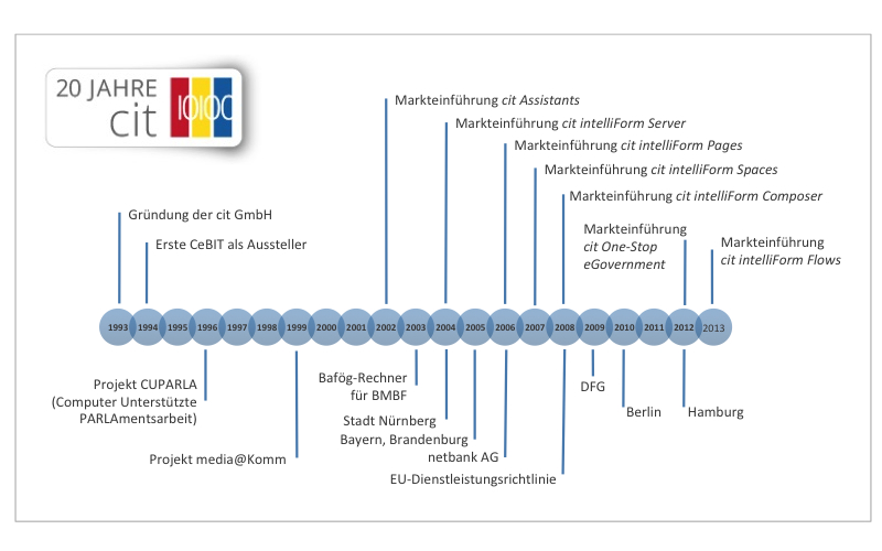 Seit 20 Jahren ist die cit GmbH im Formularserver und -management Bereich mit ihren Lösungen erfolgreich im Markt aktiv. Der langjährige Erfolg des Spezialisten mit seiner Software "Made in Germany" ist kein Zufall. Er ist das Ergebnis einer konsequenten Produktentwicklung und der Umsetzung von konkreten Lösungen in Projekten. Neben dieser Synthese kennzeichnet die cit GmbH auch ein stetiger Fokus auf den pragmatischen Einsatz modernster Technologien.