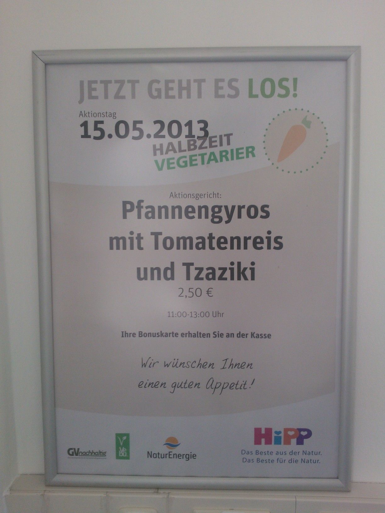 Anlässlich des HiPP Gesundheitstages am 15. Mai startet die Betriebsgastronomie des Babykostherstellers in Kooperation mit dem Vegetarierbund Deutschland (VEBU) das Projekt"Halbzeitvegetarier". Ziel dieser gemeinsamen Aktion ist es, die Mitarbeiter für den eigenen Fleischkonsum zu sensibilisieren und für fleischlose Alternativen zu begeistern.
