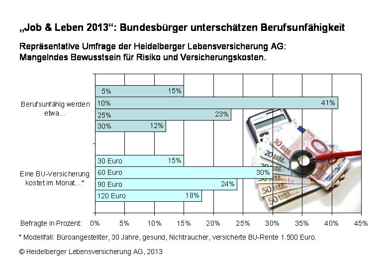 (IINews) - Heidelberg (06.05.2013) - Wie gut kennt sich die Bevölkerung mit dem Thema Berufsunfähigkeit aus? Der Großteil schätzt Risiken und Versicherungskosten falsch ein: 56 Prozent der Bundesbürger glauben, dass höchstens jeder Zehnte im Laufe seines Arbeitslebens berufsunfähig wird. In Wirklichkeit ist es jeder Vierte. Dies ist ein zentrales Ergebnis der ersten "Job & Leben"-Umfrage der GfK Marktforschung im Auftrag der Heidelberger Lebensversicherung.